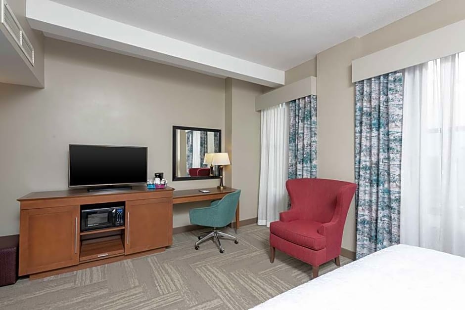 A 32 inch flat-screen TV, microwave and refrigerator are included in this mobility accessible room. There is a large work desk and coffee maker as well.